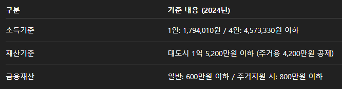 구체적인 소득과 재산 기준은 아래 표를 참고해주세요.