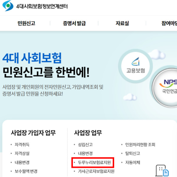 4대사회보험 정보연계센터 홈페이지를 방문하여 신청합니다. 미가입 사업장은 성립신고를, 기가입 사업장은 두루누리보험료지원을 신청하면 됩니다.
