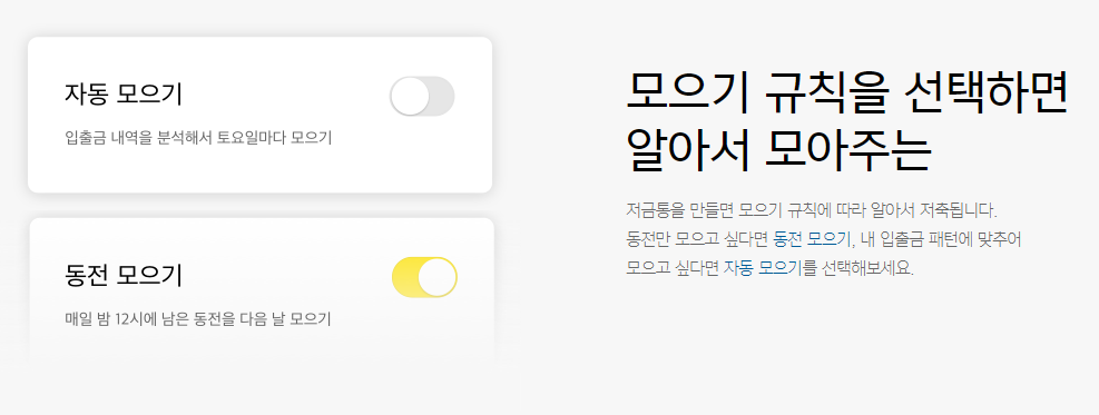 저금통의 잔돈을 모아 최대 10만 원까지 저축할 수 있으며, 필요할 때 언제든 저축액을 출금할 수습니다. 저금통을 비우더라도 저금통 계좌는 유지되어 다시 저축을 시작할 수 있습니다.