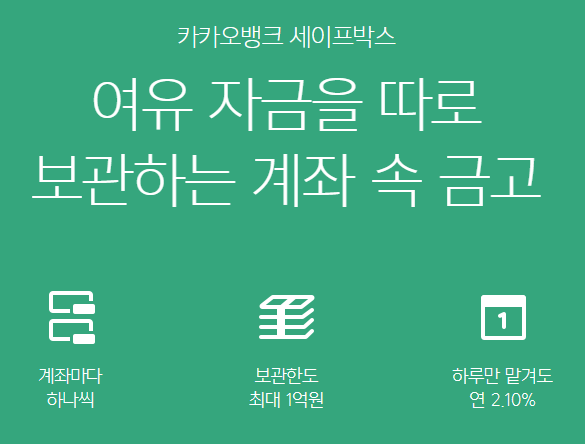 세이프박스는 하루만 보관해도 연 2.1%의 이율을 챙길 수 있는 든든한 상품입니다. 예비 자산을 효율적으로 관리하고자 하는 분들에게 추천되는 상품입니다.