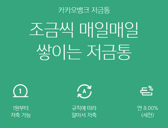 카카오뱅크 저금통은 1원부터 저축이 가능한 예금 상품입니다. 세전 연 8%의 높은 이율을 제공하여 저금을 효율적으로 할 수 있습니다.