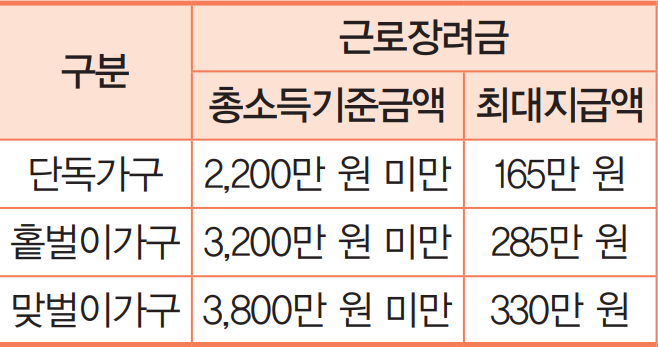 근로장려금은 가구별로 지급하는 금액의 한도가 있으며, 소득에 따라 그 한도 안에서 차등 지급됩니다.